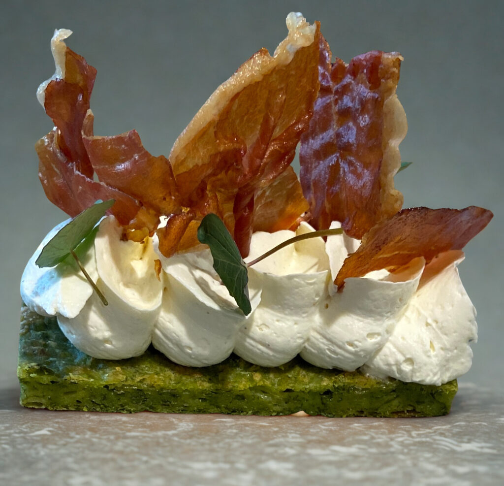 Ganache montée clémentine, insert marmelade mandarine, enrobage chocolat blanc et streusel noisette et cacao.