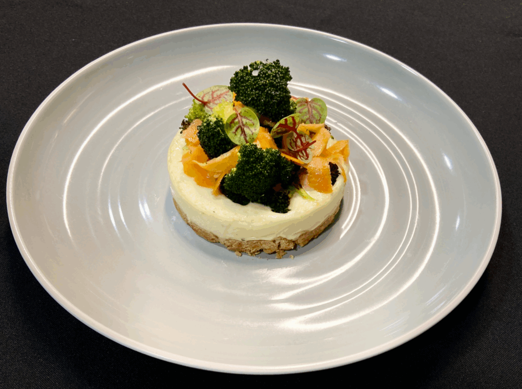 Croustillant parmesan/noix, panna-cotta de choux-fleurs, tagliatelles de carottes, brocoli braisé et micro-pousses à l'oseille.